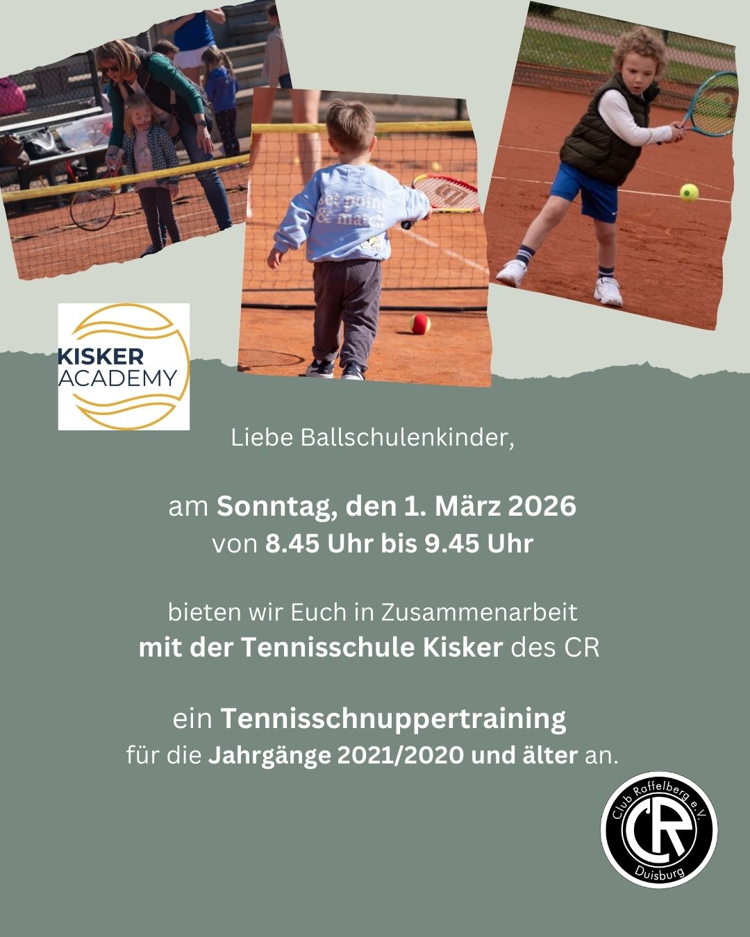 Für alle Ballschulenkinder bieten wir am Sonntag, den 1. März 2026 von 8.45 Uhr bis 9.45 Uhr in Zusammenarbeit mit der Tennisschule Kisker des CR ein Tennisschnuppertraining für die Jahrgänge 2021/2020 und älter an.